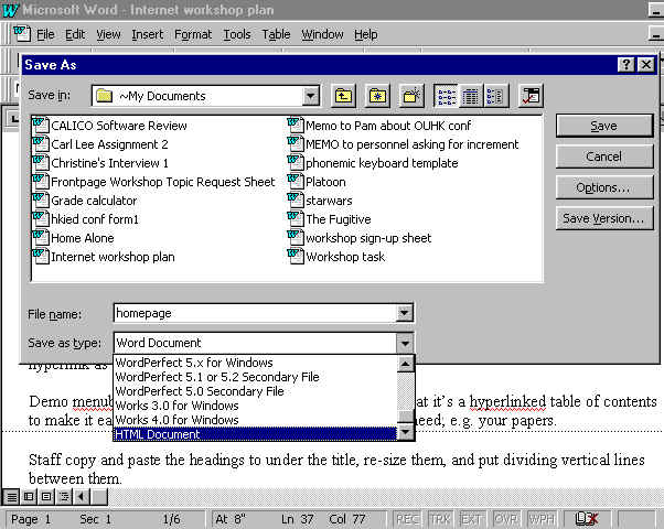 7. To save your Word page as an Internet page, click 'File', 'Save As'. You should see a big gray box called 'Save As'. At the bottom of this box it says: 'Save as type'; click the down arrow, scroll down to the bottom of the list of file types and choose 'HTML document'.