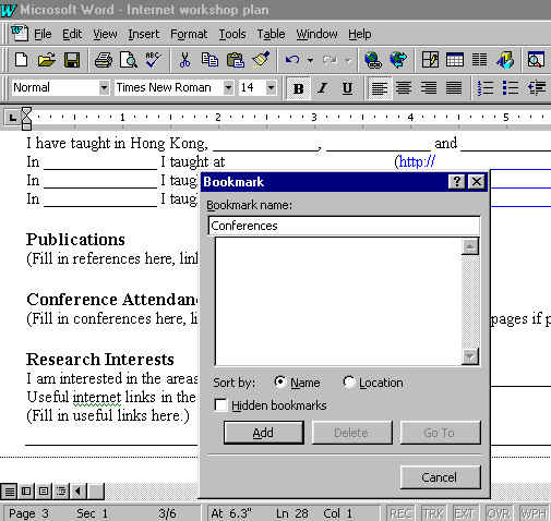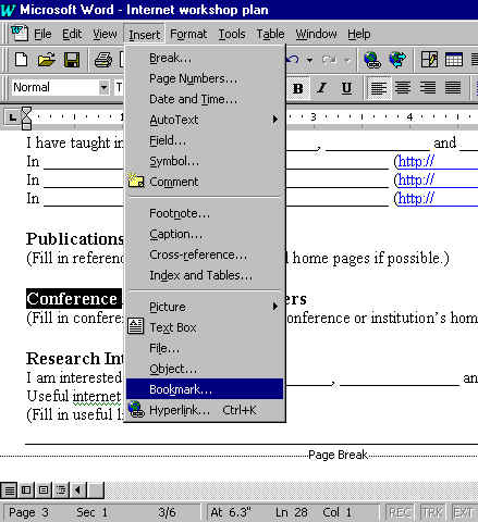 1. First you have to put in a bookmark to link to. Type in the words that you want to make into a bookmark; e.g. 'Conferences'.