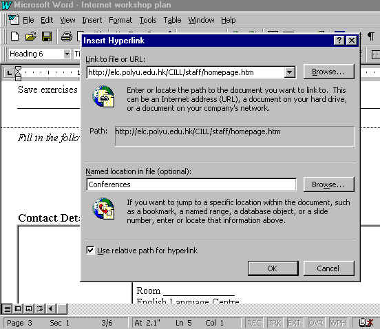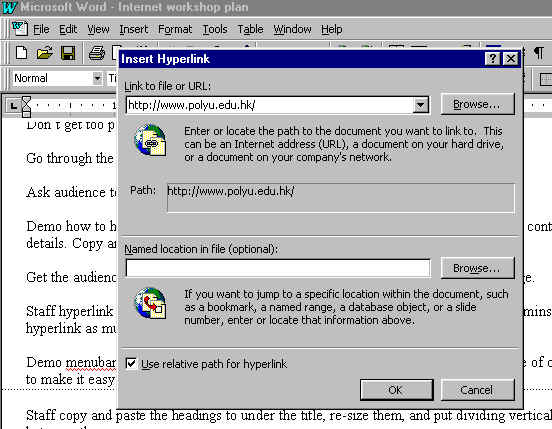 Put your cursor in the white box at the top called 'Link to file or URL:', click once in this white box, hold down the Control key on your keyboard, and still holding it down, press 'v'. This inserts the Internet address 'http://www.polyu.edu.hk/' in the white box. Then click the 'OK' button at the bottom of the big gray box.