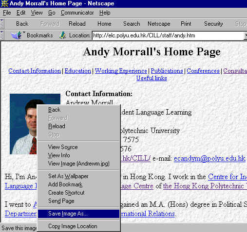 1. Go to the ELC staff homepages, go to your page, put the cursor on your picture, and click the right-hand button on the mouse. You will see a menu like this: