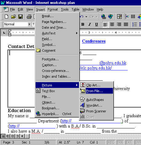 3. Go to Word and click on the page in the position where you want to insert the picture. Click 'Insert', 'Picture', 'From File'.