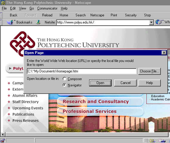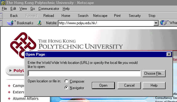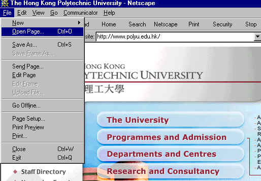 2. Use your browser (Netscape or Internet Explorer) to go to the HKPU home page. Click in the address box called 'Location:'; highlight the address, i.e. http://www.polyu.edu.hk/ ; click 'Edit' from the menu at the top; then click 'Copy'.
